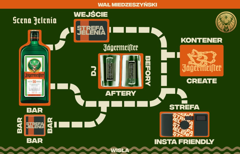 Design of an exclusive influencer gift box for Jägermeister’s ‘Deer Zone’ festival in Warsaw. The box features a custom layout that mirrors the festival’s zones and highlights key areas like the bar, artist stage, and VIP zone. Each section of the box aligns with the guest experience, featuring Jägermeister products and festival branding in vibrant colors. The internal design serves as a map for the event, combining aesthetic appeal with functional information for attendees, creating an immersive preview of the festival experience.