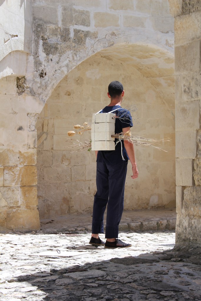 frames. They are meant as urban tools for a performative walk in space of Matera city. Historically, the sandstone is what made Matera so livable creating natural caves and enabling the settlements to date back to Paleolithic times. In the modernisation process, the local community has been disconnected from this material. By symbolically putting the tuffo back to modern districts the performers are creating a line between past, present posing a question about the future. The objects are meant to raise discussion. Performer’s actions are secondary to the stories collected on the way from the local community.